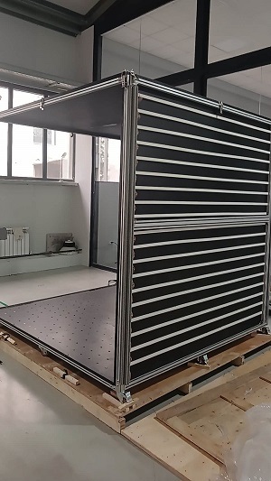 डिवाइस के आयाम हैं: आधार 1000 मिमी x 1000 मिमी और 1 0 00 मिमी की ऊंचाई के साथ, दो तरफ प्लेटें, एक तल और एक शीर्ष प्लेट शामिल है, शीर्ष प्लेट को हटाया जा सकता है, पहियों के साथ संरचना पर घुड़सवार नीचे की प्लेट, अपने आंदोलन की अनुमति दें।
